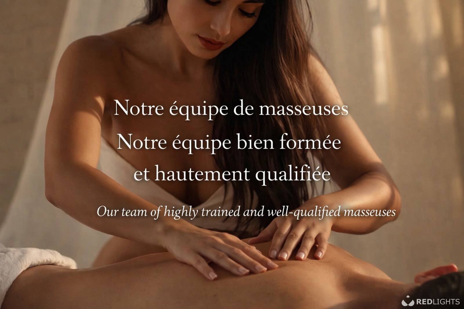 In het gouden schemerlicht, met de warmte van kaarsen en lauwe olie die over het lichaam glijdt, terwijl de ademhaling dieper wordt… begint alles zachtjes te gloeien. Handen verkennen, strelen, vertragen… tot elke zenuw ontwaakt.