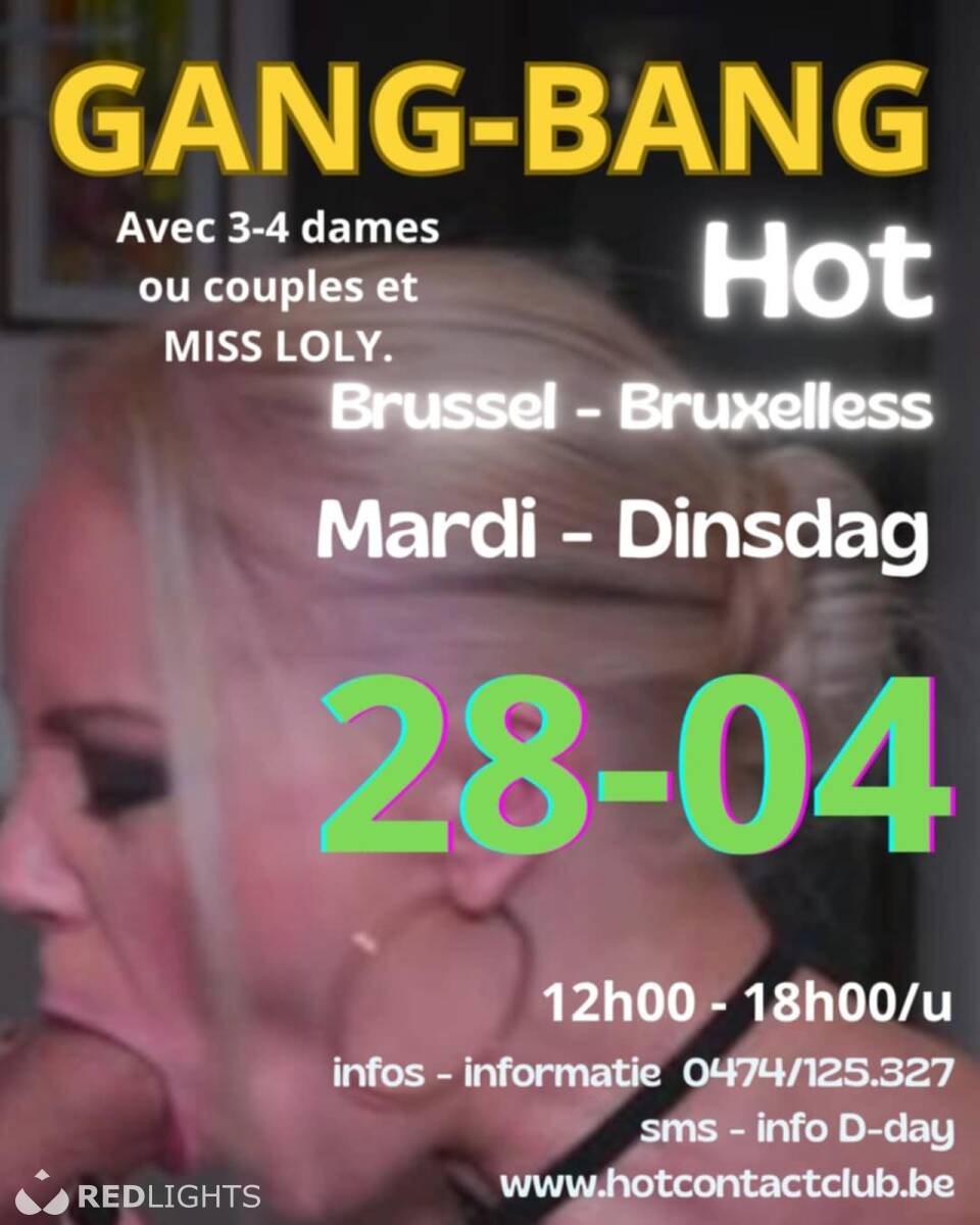 DINSDAG 28 APRIL 26 , Van 12u tot 18u " GANG BANG HOT BRUSSEL" SEX GEGARANDEERD MET MINIMUM 3-4 DAMES ERG WARM MET MISS LOLY ..... Mannen , vrouwen en koppels Zonder schaamte en taboes, respect en een goed humeur! Beleef een onvergetelijk moment bij ons ... in een discrete appartement in het centrum van de stad( WTC) . Voor Mannen 90€, Koppels en Actieve vrouwen GRATIS TOEGANG !!! Met ons mee ? Reservatie via telefoon , Sms of e-mail www.hotcontactclub.be - 0474 125 327 - hcclub@outlook.be